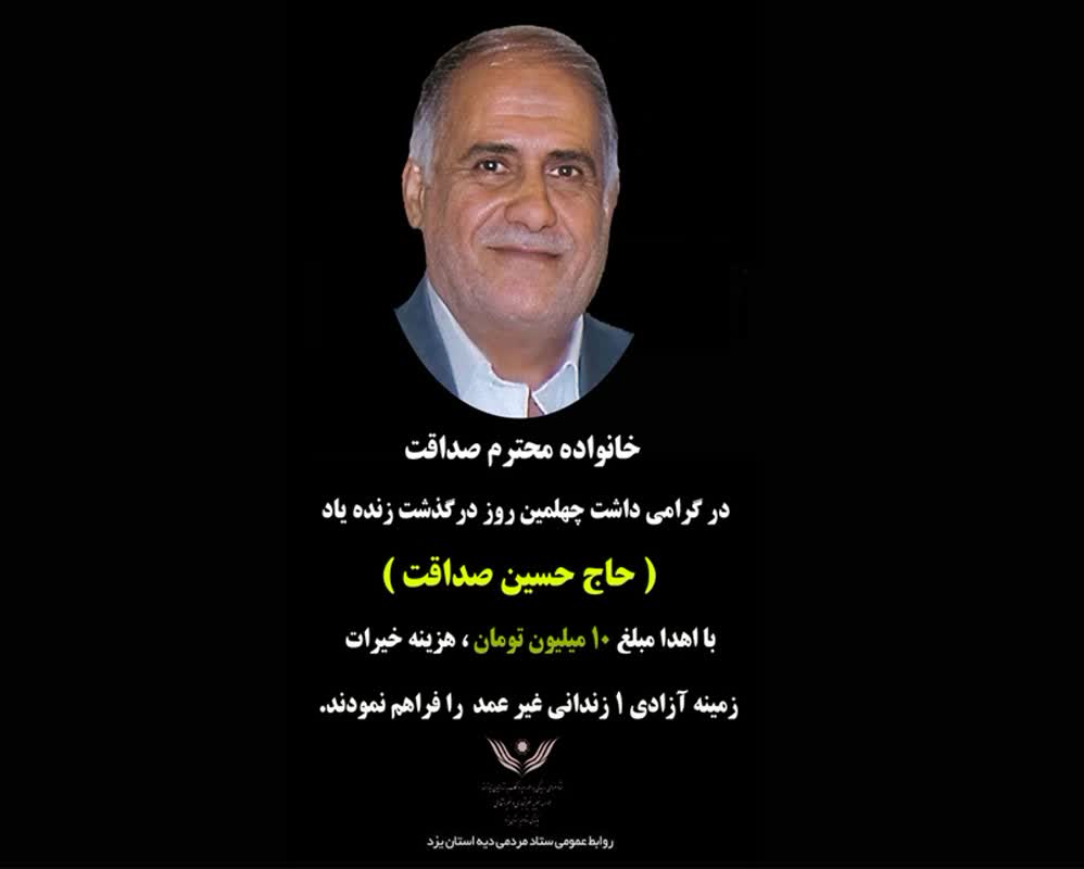 به نقل از روابط عمومی ستاد مردمی دیه استان یزد؛ همزمان با سه شنبه (۶ آبان) همسر و فرزندان مرحوم ( حاج حسین صداقت ) مبلغ ۱۰۰ میلیون ریال بخشی از هزینه مراسم چهلم آن مرحوم را جهت مشارکت در آزادی یک زندانی غیر عمد اهدا کردند.