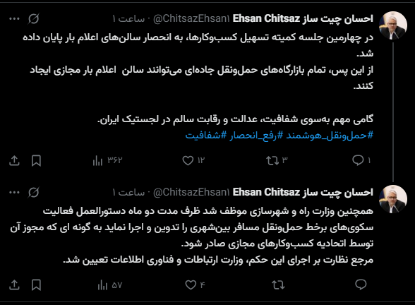 به نقل از ایرنا، «احسان چیت ساز» روز دوشنبه در نوشتاری که در صفحه شخصی خود در شبکه اجتماعی ایکس منتشر کرد، نوشت: در چهارمین جلسه کمیته تسهیل کسبوکارها، به انحصار سالنهای اعلام بار پایان داده شد. از این پس، تمام بازارگاههای حملونقل جادهای میتوانند سالن اعلام بار مجازی ایجاد کنند. گامی مهم بهسوی شفافیت، عدالت و رقابت سالم در لجستیک ایران.