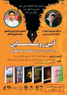 به گزارش افق امروز به نقل از روابط عمومی سازمان اسناد و کتابخانه ملی استان یزد، آیین رونمایی از شش اثر تازه منتشرشدهی نویسنده جوان